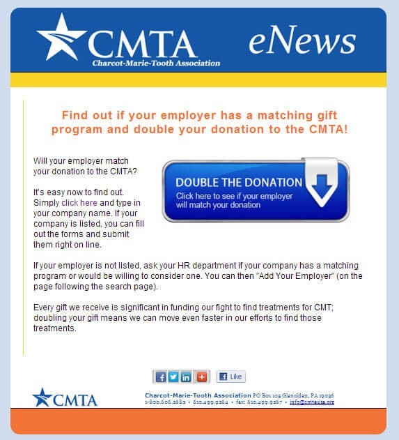The Charcot-Marie-Tooth Association (CMTA) has used their eNews email to let donors know about matching gifts.
