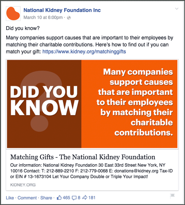 - They included a graphic. The National Kidney Foundation’s graphic matches their organization’s colors and includes a fact about matching gifts. This creates visual interest and draws your followers’ eyes to your post.